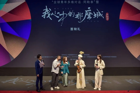 7月1日,電影《我心中的那座城——阿勒泰》首映禮暨“全球青年多維對話”專場活動在北京華夏電影中心舉行。中國文聯黨組成員、書記處書記謝力,中國影協分黨組書記、駐會副主席鄧光輝,中國文聯辦公廳主任周由強,北京市廣電局黨組成員、副局長韓新星,中共阿勒泰地委委員、秘書長、宣傳部部長藍盛新,本片文學總監梅峰、剪輯指導周新霞、總制片人郝為,中國文聯國內聯絡部副主任、一級巡視員苗宏,中國電影出版社社長余寧,中國文聯電影藝術中心常務副主任宋智勤,中國外文局文化傳播中心副主任王侃,以及在京專家學者、藝術家代表侯光明、邢占宇、馬維干、張衛、吳軍、胡建禮、朱玉卿、焦洋、陳瀟瀟等,與青年電影人和來自全球多國的優秀青年代表等近300人一同參加活動。