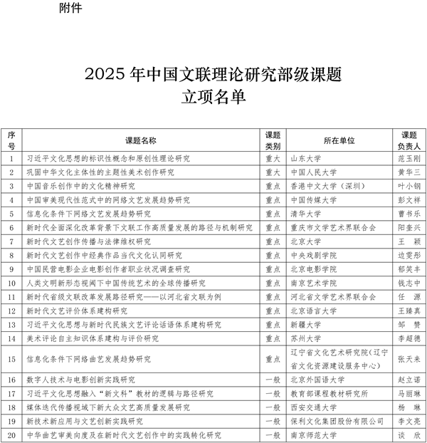 《2025年中國文聯理論研究部級課題申報指南》于2025年2月25日在《中國藝術報》、中國文藝網正式發布,得到了中國文聯各團體會員、全國各高等院校、相關研究機構及組織的積極響應和大力支持。經嚴格評審,共有20個課題組入選2025年中國文聯理論研究部級課題(具體課題名稱、類別、單位及負責人詳見附件)。