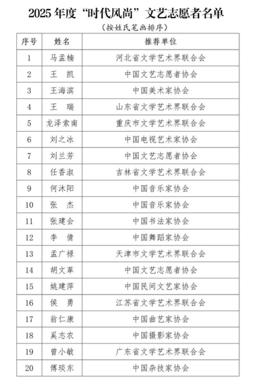 為了積極培育和踐行社會主義核心價值觀,大力弘揚“奉獻、友愛、互助、進步”志愿精神,培育志愿文化,發揮文藝志愿者先進典型示范引領作用,中國文聯開展了2025年度“‘時代風尚’文藝志愿者”宣傳選樹項目。經過擇優推薦、專家推選等環節,確定了2025年度“時代風尚”文藝志愿者名單,現予以公示。